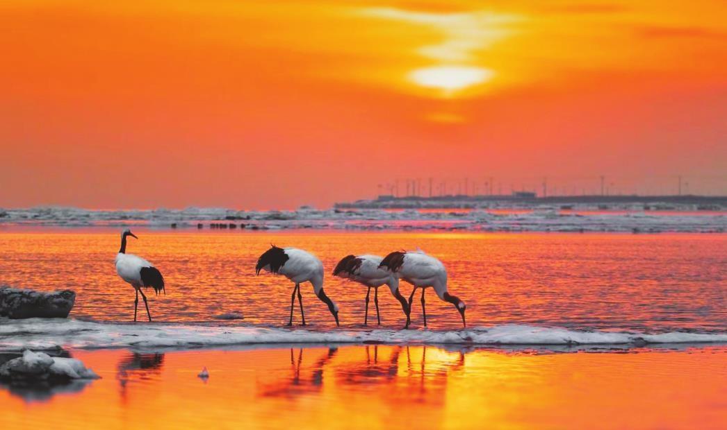 В водно-болотном угодье города Инкоу, провинция Ляонин, несколько журавлей либо неподвижно стоят, либо склоняют головы в поисках пищи, демонстрируя изящные позы.
