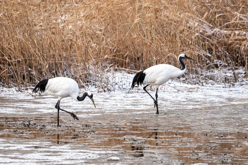 On a winter morning, pristine snow draped the tranquil land of Yongyuanjiao Wetland in Yingkou City, Liaoning Province, where a pair of red-crowned cranes were seen elegantly foraging. Their vermilion crests gleamed amid pure white snow, manifesting the intoxicating beauty of ecological harmony.