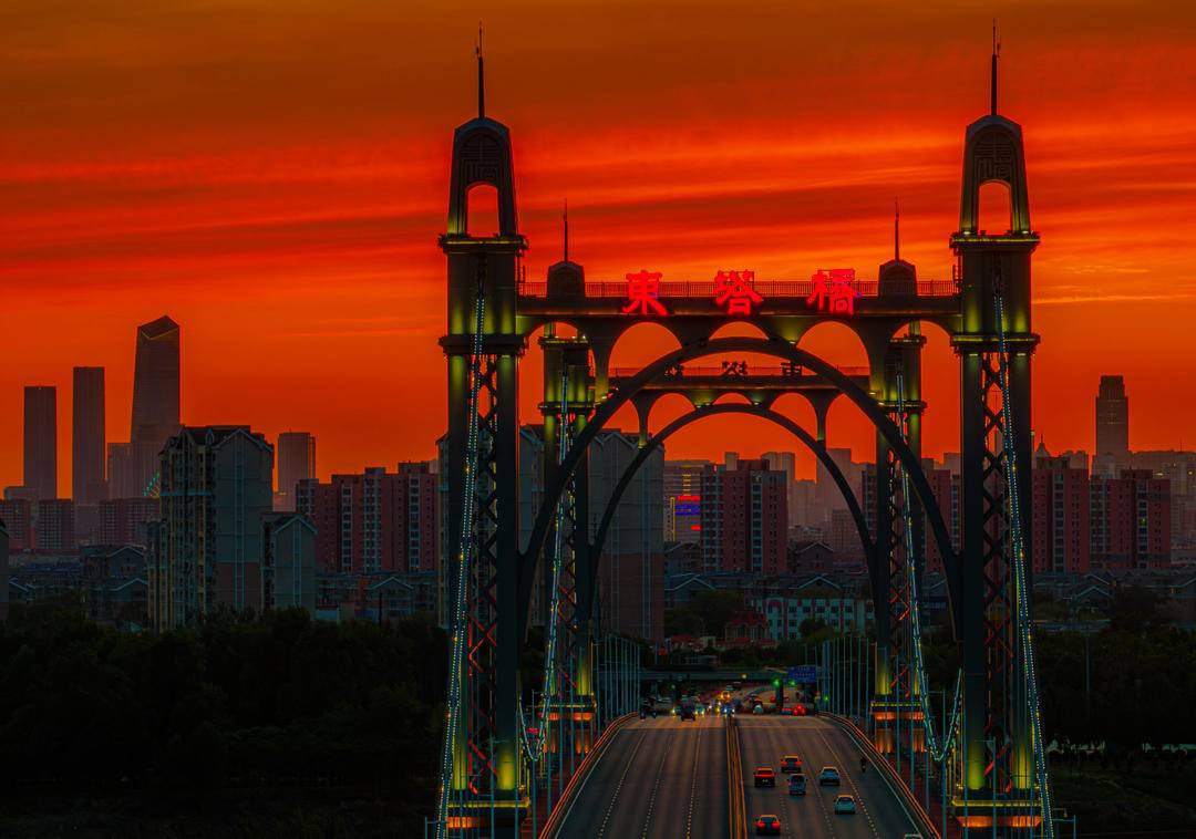 At dusk, the setting sun gilds the Dongta Bridge of Shenyang City, Liaoning Province, and silhouettes its surrounding high-rise buildings. As the clouds in the sky gradually turn orange to red, the Hunhe River under the bridge is shrouded with the same hues, blending seamlessly with the sky. An artistic and picturesque view unfolds when the bridge lights are illuminated.