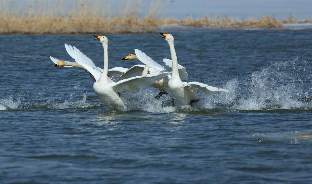 In the Baishi Wetland of Beipiao County-level City, Chaoyang City, Liaoning Province, tens of thousands of swans gather here to rest, creating a spectacular “white wave” sweeping across the waters. Their white plumage gleams brightly against the azure sky and waters, adding a touch of elegance and romantic splendor to this land.