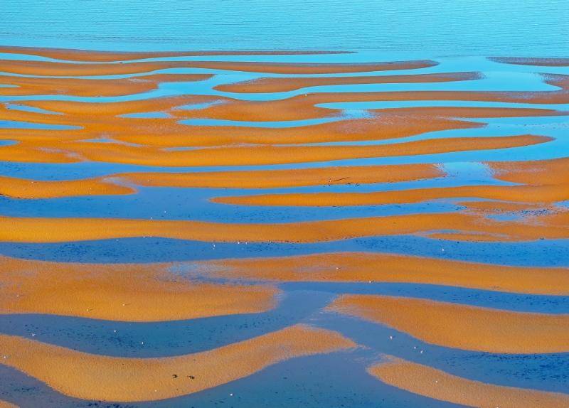 An aerial view of the northern Bohai Sea area near Ganjingzi District, Dalian City, Liaoning Province, shows how a receding tide scours out beautiful landscapes of sand dunes and water puddles on mudflats. Under the setting sun, the yellow-red sand and azure waters blend seamlessly, creating a breathtaking seaside panorama.