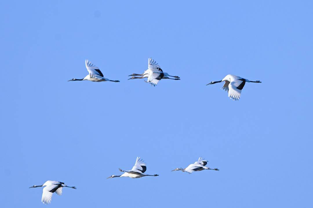 In the Liaohe River Delta of Panjin, Liaoning Province, two large flocks of wild red-crowned cranes can be seen foraging and resting peacefully in the distance. From time to time, they soar gracefully through the sky with their wings spread wide.
