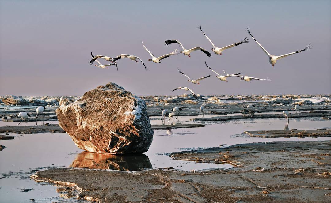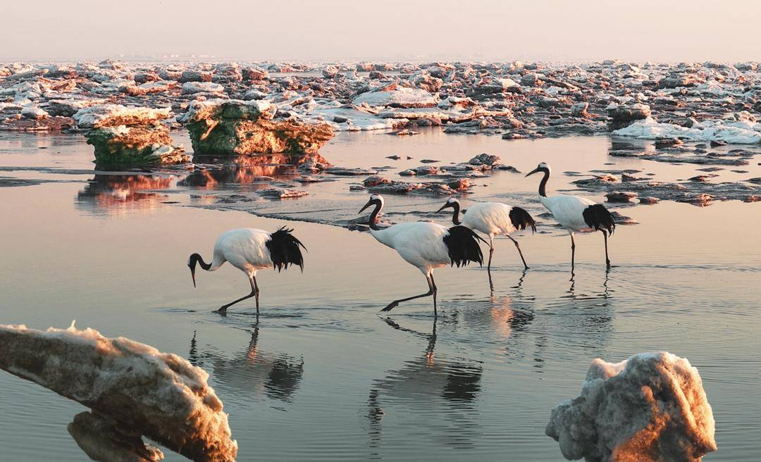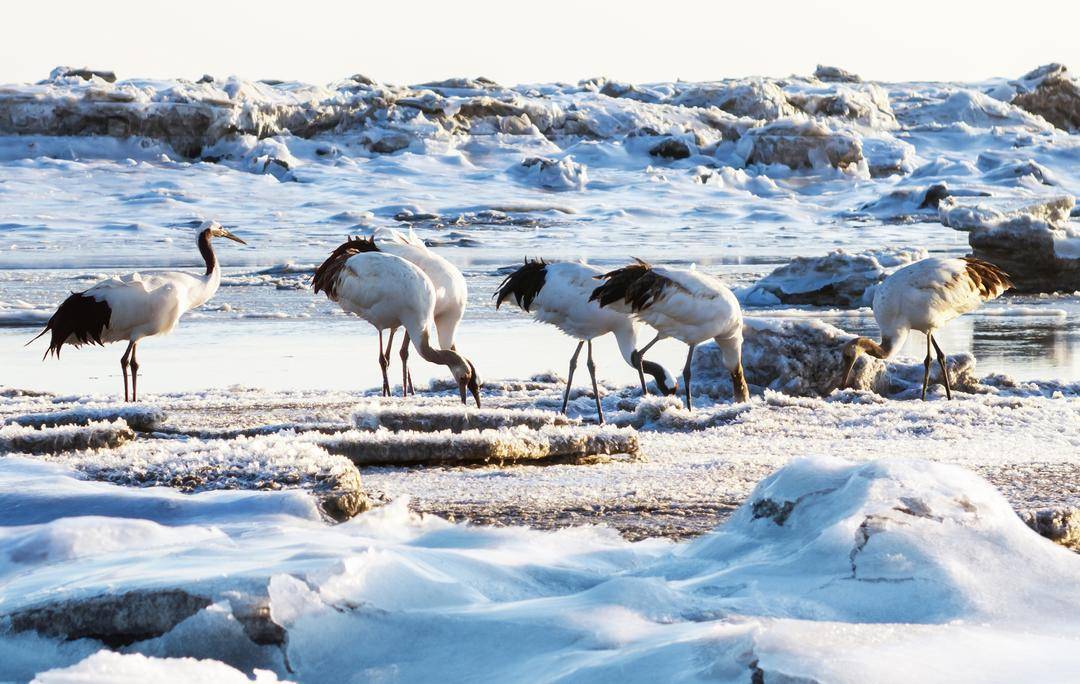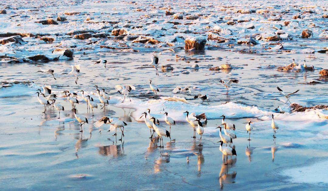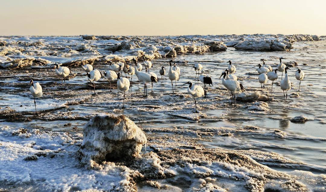 The Panjin Liaohe River Estuary Wetland has welcomed a gathering of five crane species: white cranes, hooded cranes, common cranes, white-naped cranes, and red-crowned cranes. With crisscrossing water systems and abundant biological resources, the wetland serves as a well-stocked “natural canteen” for cranes.