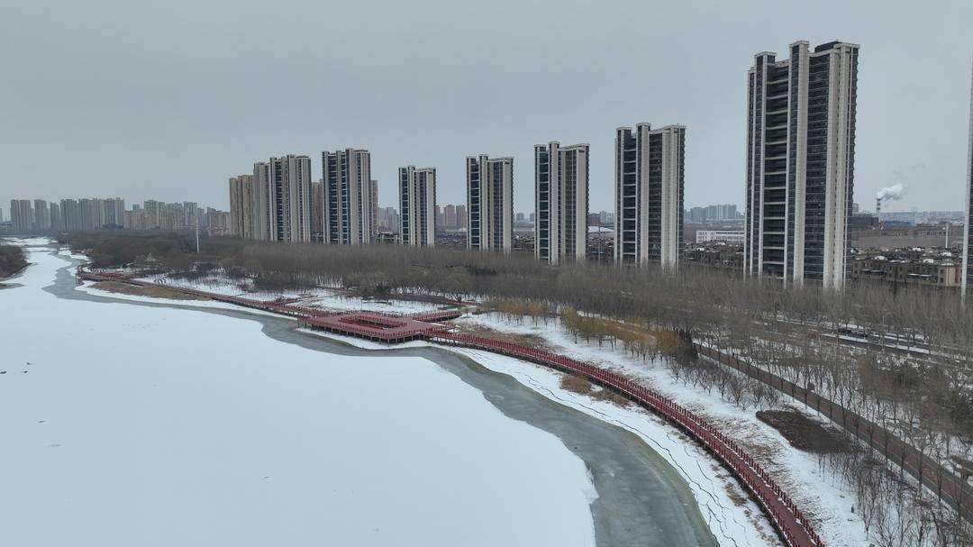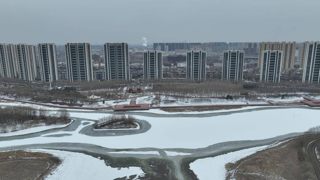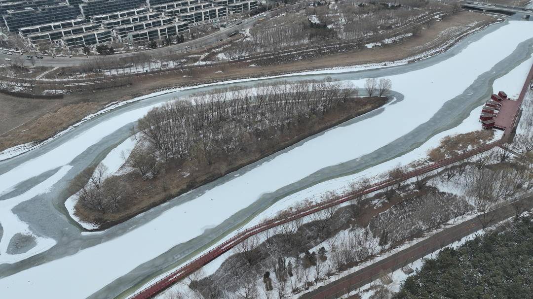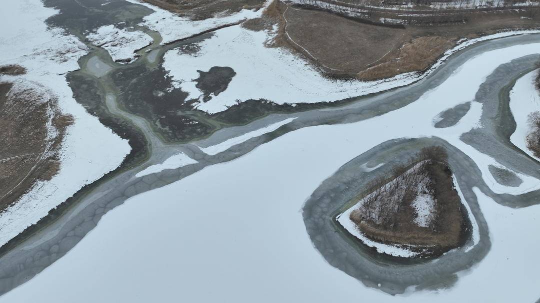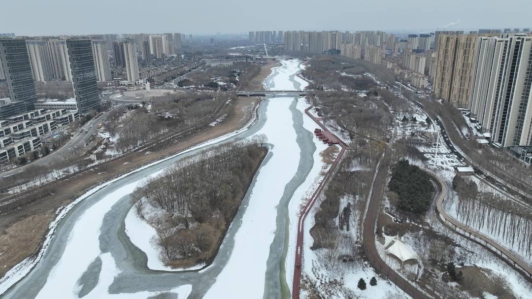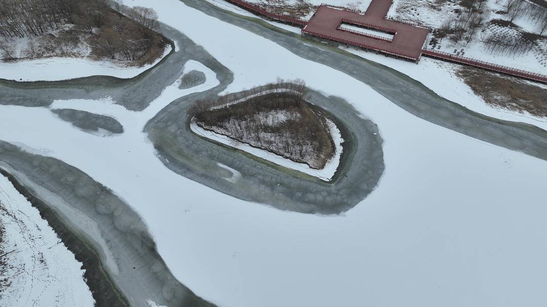A bird’s-eye view of the Puhe River Ecological Corridor in Shenyang, Liaoning Province, reveals the frozen river slowly thawing. Flowing water along the banks contrasts with the snow-covered surface, painting a vibrant ecological scene.