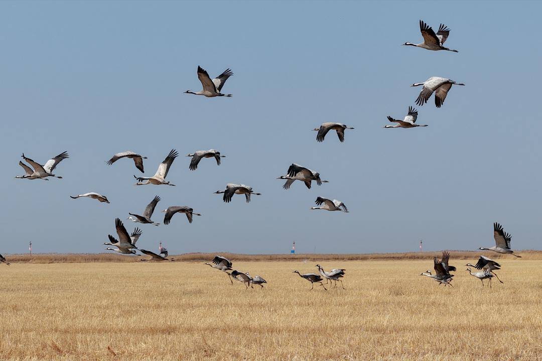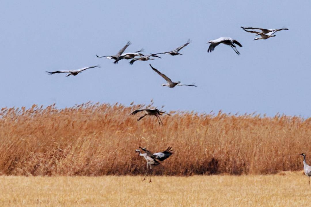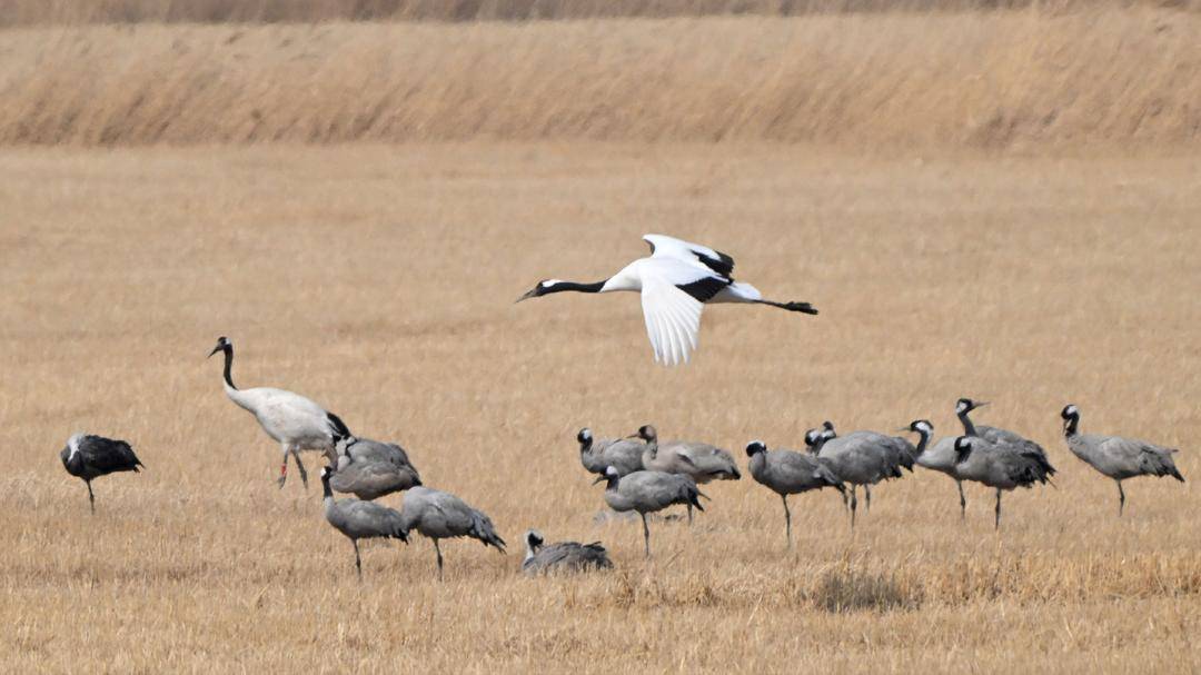 Flocks of cranes gather at the Liaohe River Estuary Wetland in Panjin, Liaoning Province. More than 200 cranes forage and rest in the wetland. They sometimes pause among the reeds, and sometimes soar gracefully in the sky, presenting a splendid ecological picture.