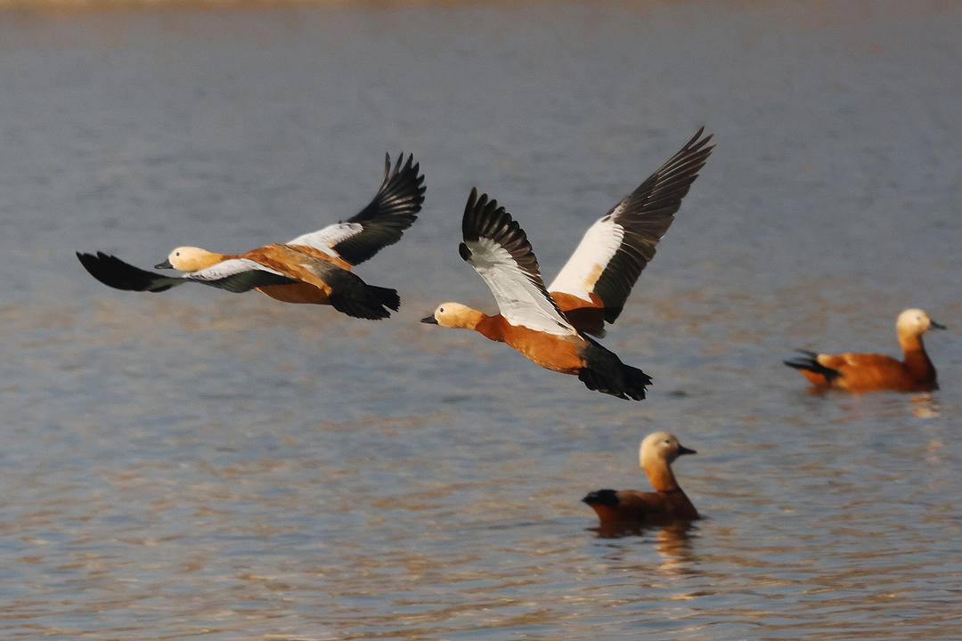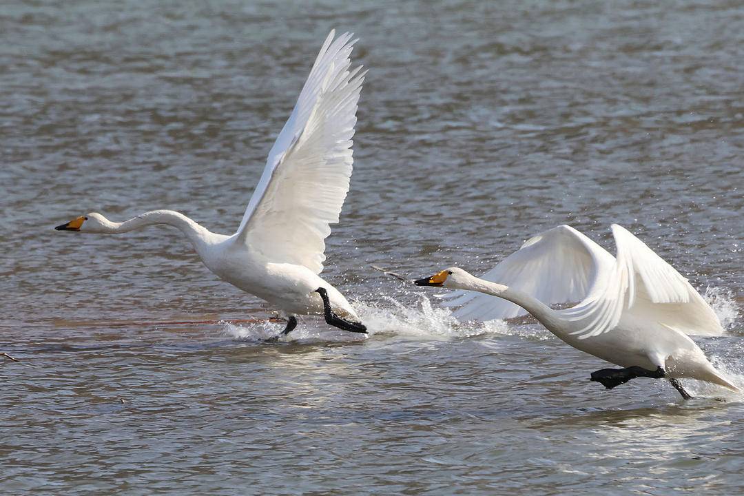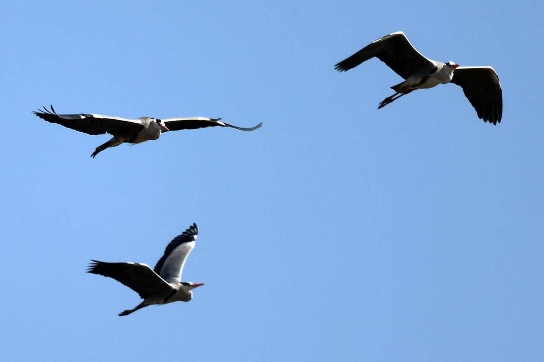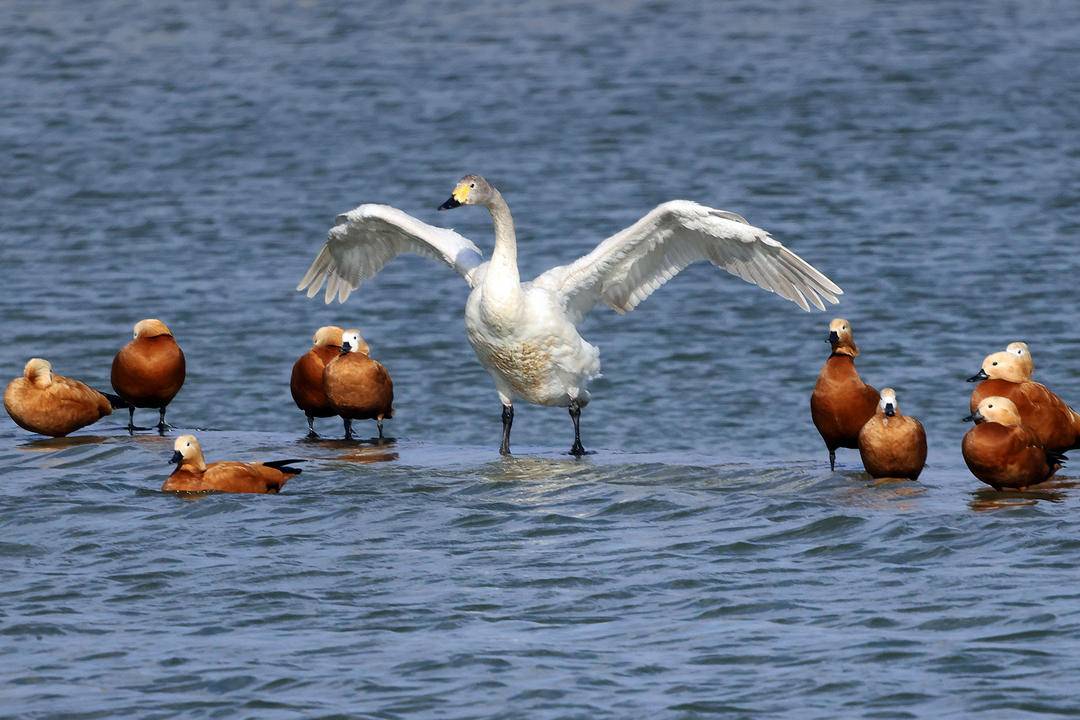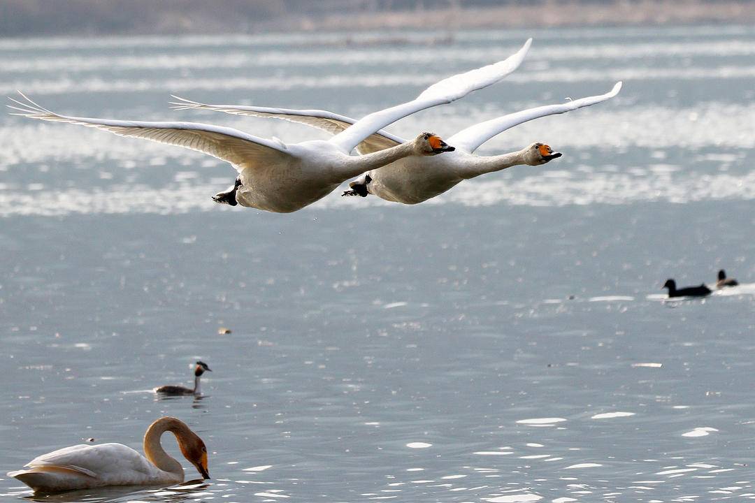 As the spring breeze brings warmth, all living things are renewed with vitality. Along the Daling River in Chaoyang City, Liaoning Province, flocks of swans sing gracefully, while herons soar and circle. Their joyful chirping echoes through the air, creating a beautiful symphony of spring.