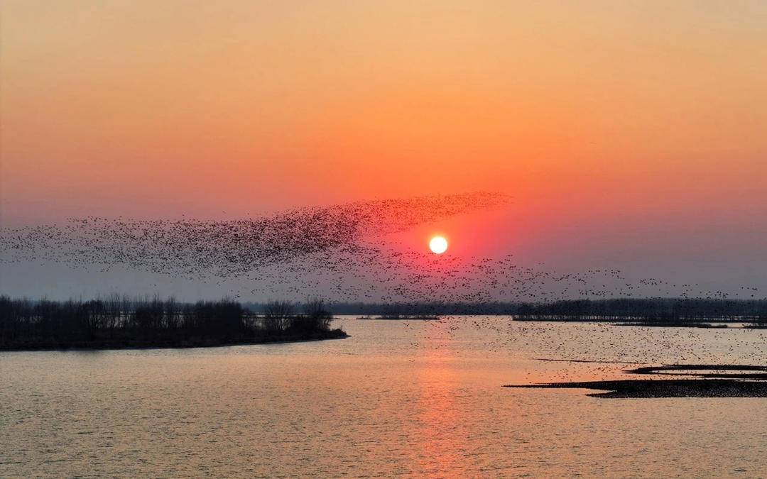 As the setting sun bathes Panjin’s Wetland in Liaoning Province in warm orange hues, tens of thousands of oriental white storks form spectacular bird waves, creating a magnificent ecological painting.