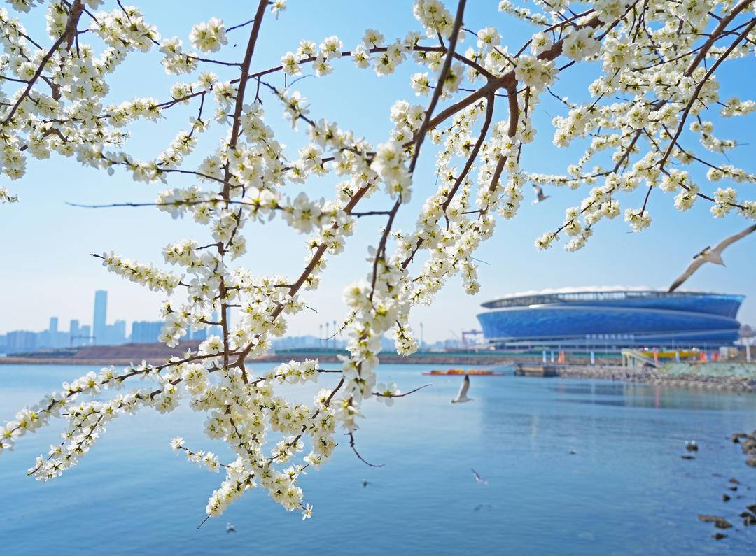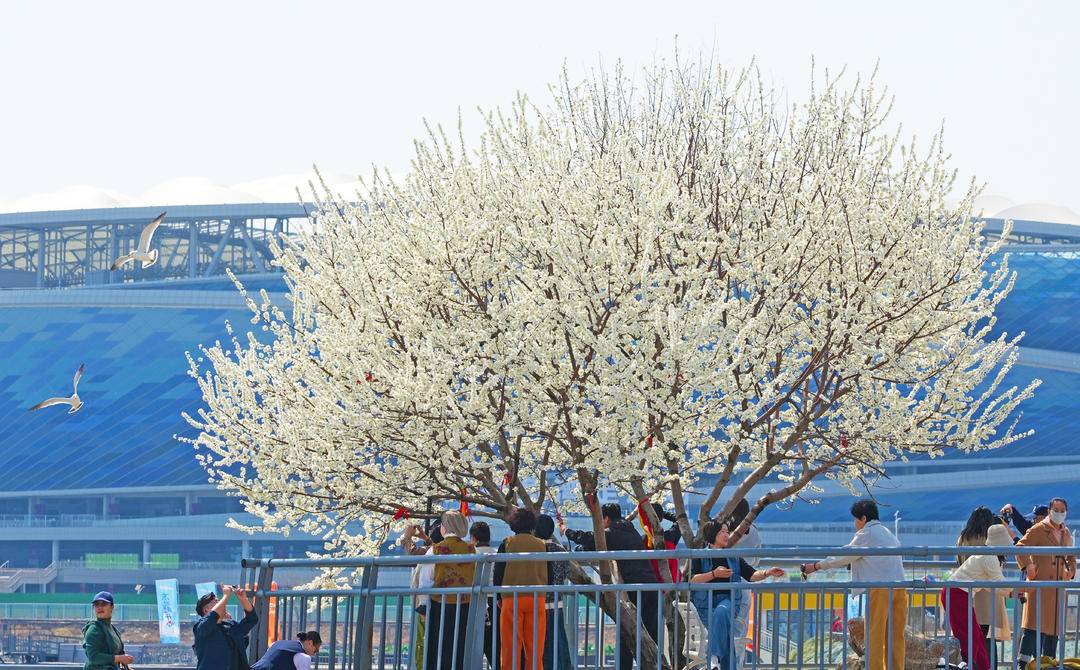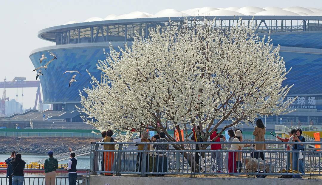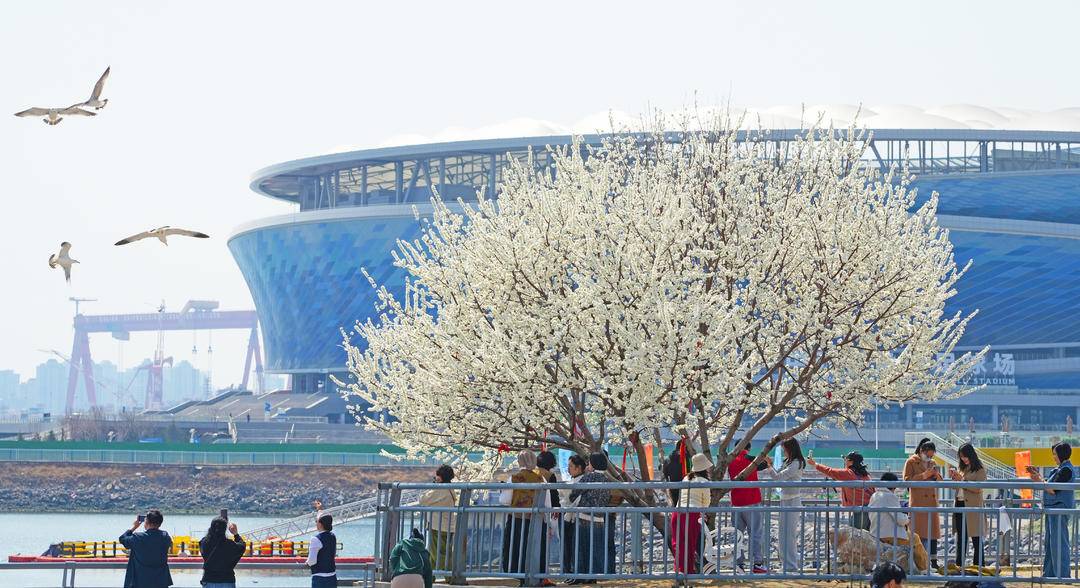 The white flowering peach tree on the east shore of Diamond Bay in Dalian, Liaoning Province is now in full bloom. As the only flowering tree along the shore, it has been affectionately dubbed the “Lonely Tree” by locals. Yet it is anything but lonely. Visitors flock here year-round to admire it and capture its beauty.