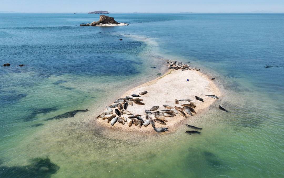 A group of plump spotted seals are lying on sandbanks at the Dalian Spotted Seal National Nature Reserve in Liaoning, basking in the sun with their bellies up.