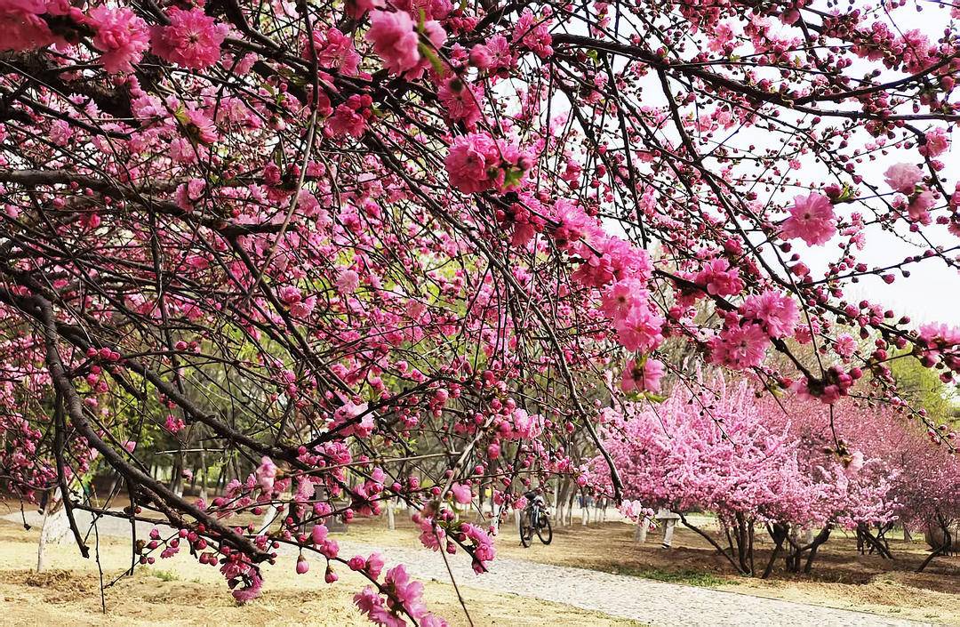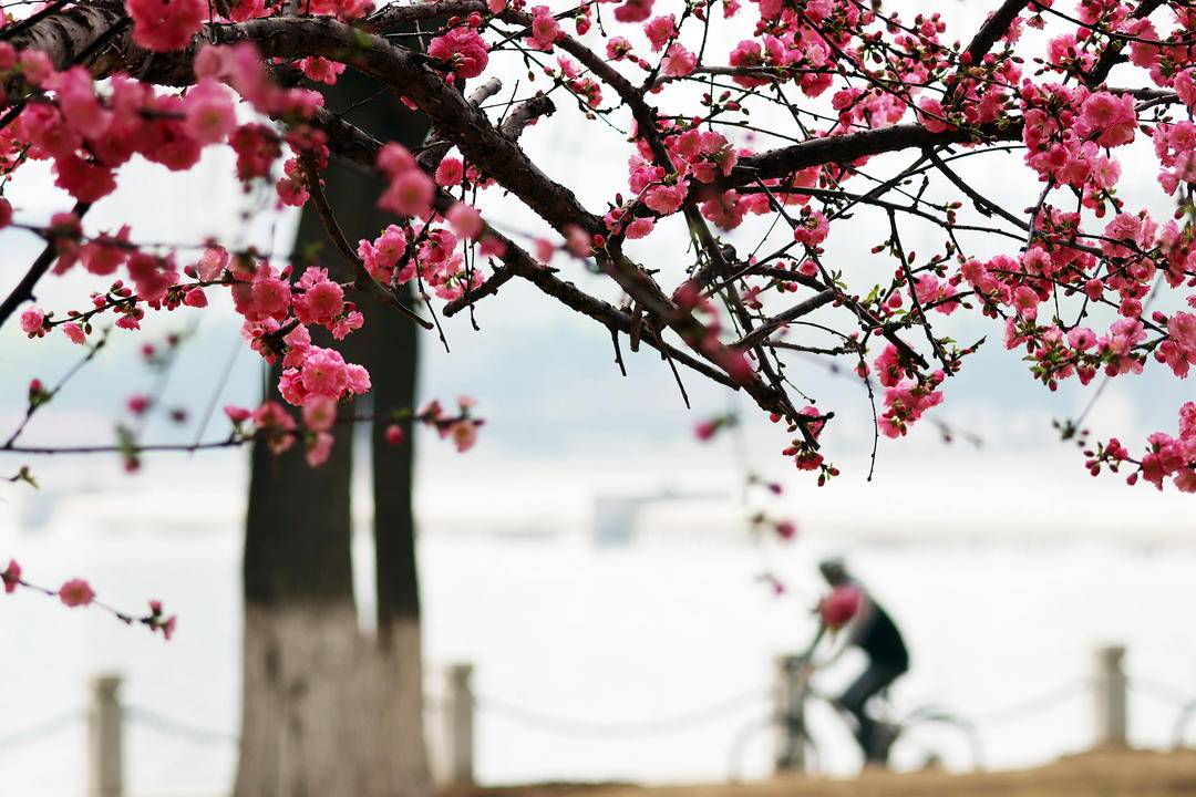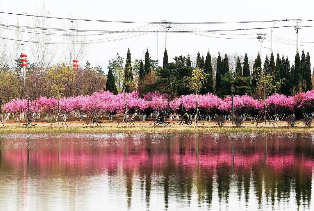 On the banks of the Daling River, Chaoyang, Liaoning Province, pink flowering plums are in full bloom. Their delicate blossoms are mirrored in the gentle water, painting a breathtaking spring scene. Would you come for a spring walk here?