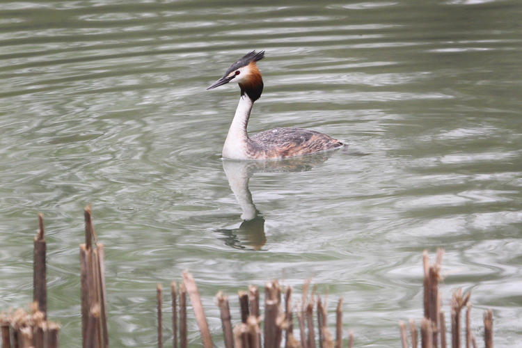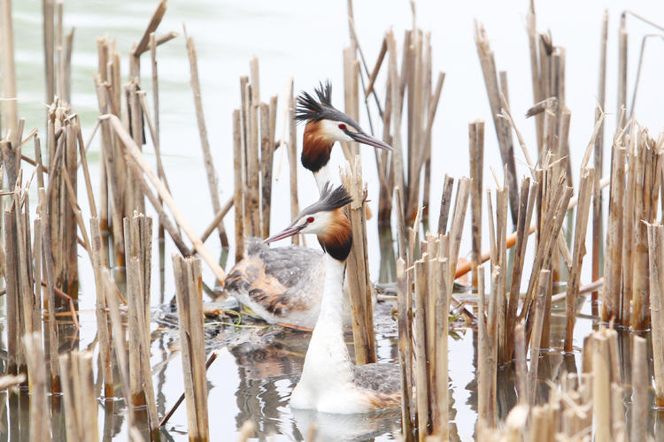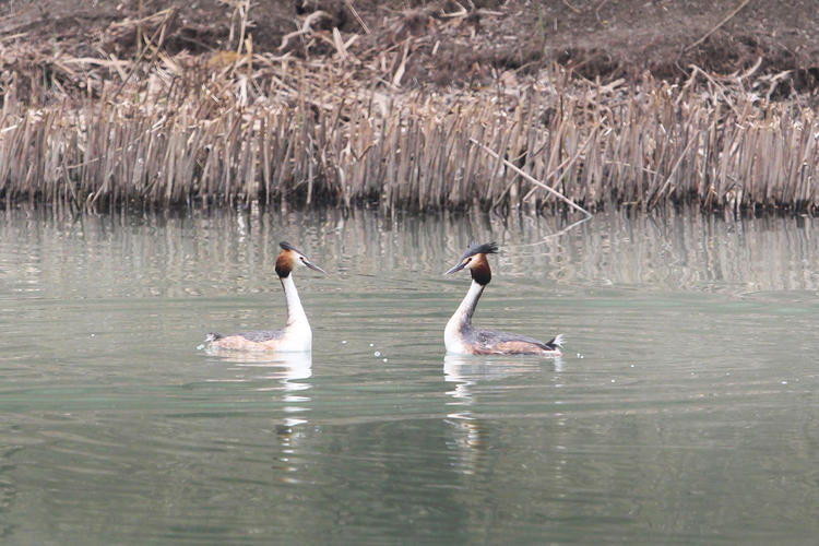 Spring arrives at Dingxiang Lake in Shenyang, Liaoning Province. Paired great crested grebes swim and play on rippling water, showing the beauty of Liaoning’s natural ecology.