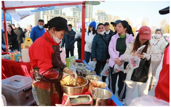 14日下午,营口展位前歌声响起,子鱼剧社的演员们身着汉服、脚踩高跷,载歌载舞,迅速吸引众人围观。“我们带来了最具营口与集市代表性的产品,希望通过非遗表演,传承民俗文化,发扬东北特色。”营口鲅鱼圈红旗大集文创主理人赵香宁表示,红旗大集作为拥有300多年历史的省级文化产业示范基地,希望实现民俗文化与体育赛事的“双向奔赴”。