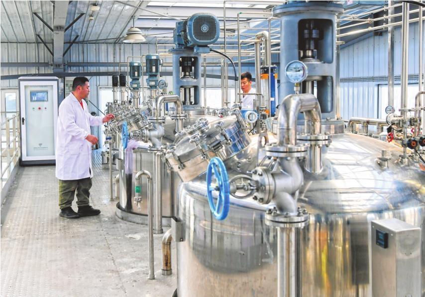 图为朝阳八方生物科技有限公司员工在微生物发酵车间工作。
