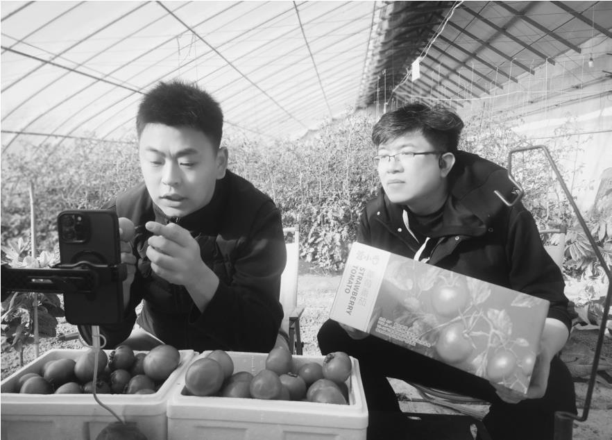 每天下午代鹏(右)和助手在草莓番茄大棚做现场直播。 本报记者 佟利德 摄