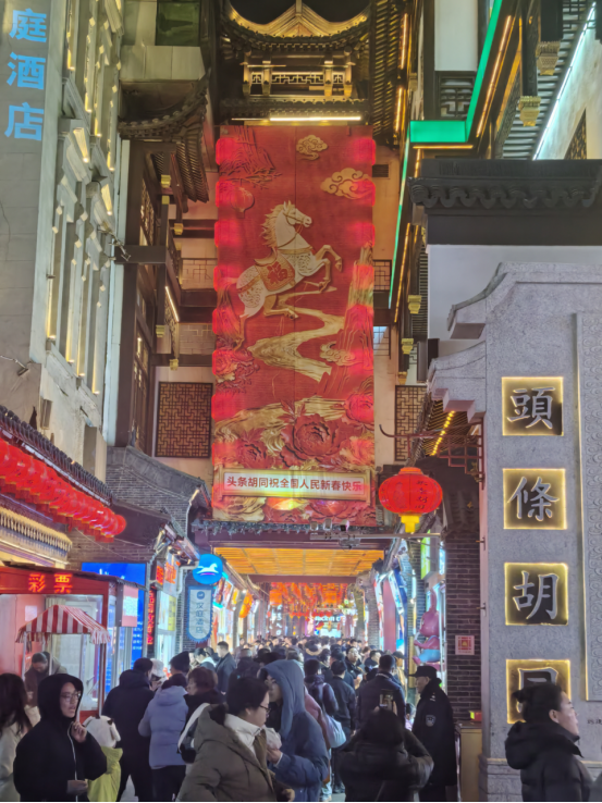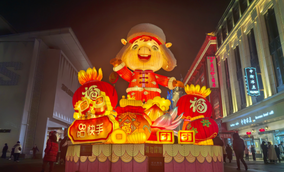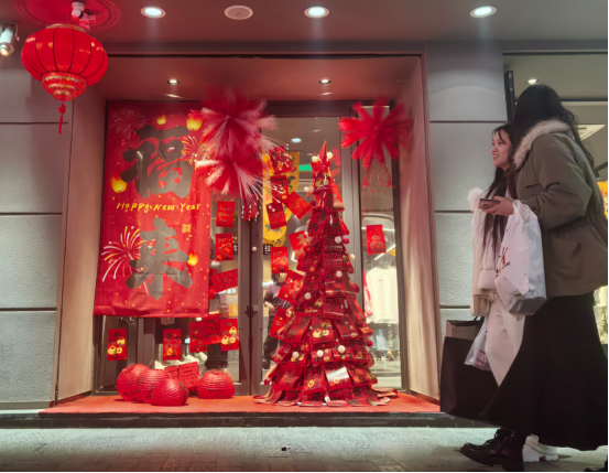 鳞次栉比的商铺装饰一新,门前挂满红灯笼,玻璃橱窗上贴着剪纸窗花,各色年货琳琅满目。熙熙攘攘的人潮涌动,人们纷纷前来购物娱乐,游览打卡,洋溢着轻松愉悦的笑容。