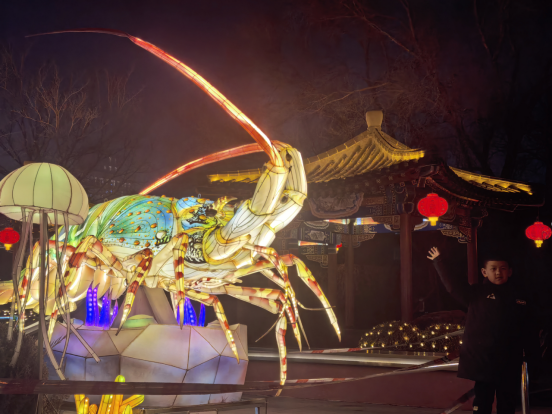 故宫东墙旁,有一处彩灯海鲜区,龙虾灯、螃蟹灯、墨鱼灯……纷纷亮相,造型生动逼真,色彩斑斓,有的还能游动,非常有趣。